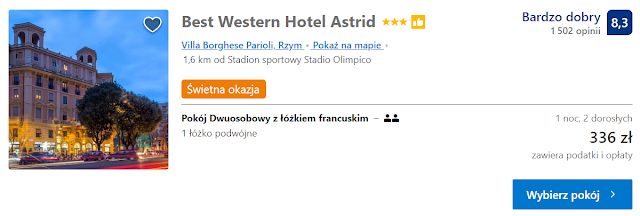 Innym obiektem godnym uwagi jest Best Western Hotel Astrid. Za nocleg w pokoju jedno/dwuosobowym zapłacimy 340 zł/336 zł (168 zł os./noc).