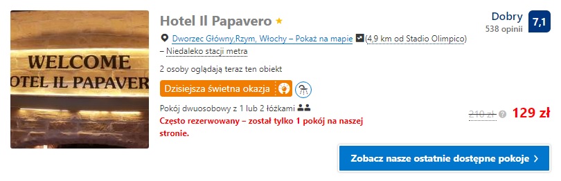 Proponujemy nocleg w obiekcie Il Romitello gdzie za dwie noce w pokoju dwuosobowym ze śniadaniem zapłacimy ok. 345 zł ( ok. 87 zł os./noc – w cenę wliczyliśmy podatek miejski). W przypadku jednego noclegu proponujemy obiekt Hotel Il Papavero gdzie za noc w pokoju dwuosobowym zapłacimy ok. 156 zł ( ok.88 zł/os./noc – w cenę wliczyliśmy podatek miejski)