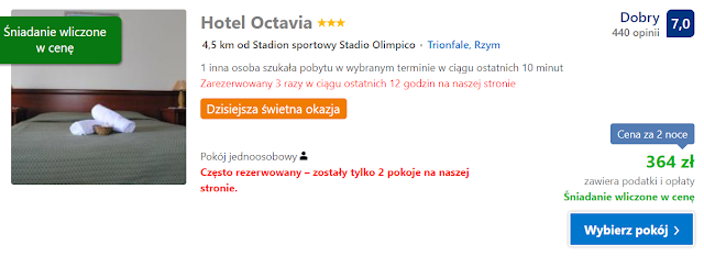 Alternatywą może być Hotel Octavia, gdzie za nocleg w tym samym terminie zapłacimy 381 zł* za jedną oraz 474 zł* za dwie osoby (118,5 zł os./noc). Śniadanie wliczono do oferty.