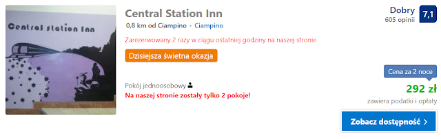 Proponujemy Central Station Inn, w którym dwudniowy nocleg będzie nas kosztować 292 zł za pokój jednoosobowy oraz 344 zł za pokój dwuosobowy (86 zł os./noc).