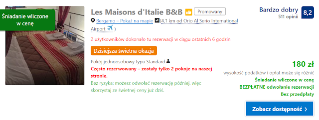 Droższym, aczkolwiek wyżej ocenianym miejscem jest B&B Bergamo Romantica. Tutaj koszt noclegu wraz ze śniadaniem w pokoju jedno i dwuosobowym wynosi kolejno 279 zł oraz 327 zł (163,5 zł os./noc).