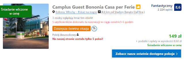 Prezentujemy poniższe obiekty, które znajdują się niedaleko newralgicznych miejsc. Pierwszym z nich to Camplus Guest Bononia Casa per Ferie znajdujący się niecałe pięć kilometrów od stadionu Stadio Renato Dall’Ara. Koszt noclegu w dniach 18-19 grudnia wynosi 158 zł za pokój jednoosobowy oraz 192 zł za dwuosobowy (96 zł os./noc). W cenie pobytu wliczono śniadanie.