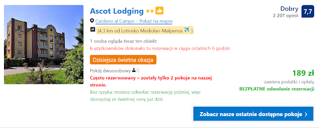 Dla kibiców, którzy będą odlatywać z lotniska Mediolan Malpensa polecamy obiekt Ascot Lodging. Za nocleg w pokoju dwuosobowym zapłacimy 189 zł (89,5 zł os./noc).
