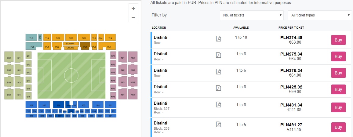 Na dzień dzisiejszy Genoa nie prowadzi sprzedaży otwartej w internecie. Być może takie bilety pojawią się w sprzedaży na kilka dni przed wydarzeniem. Na chwilę obecną bilety dostępne są na rynku wtórnym. Za najtańszą wejściówkę zapłacimy już od ok. 330 zł a bilet otrzymamy w formie elektronicznej REZERWUJ====>