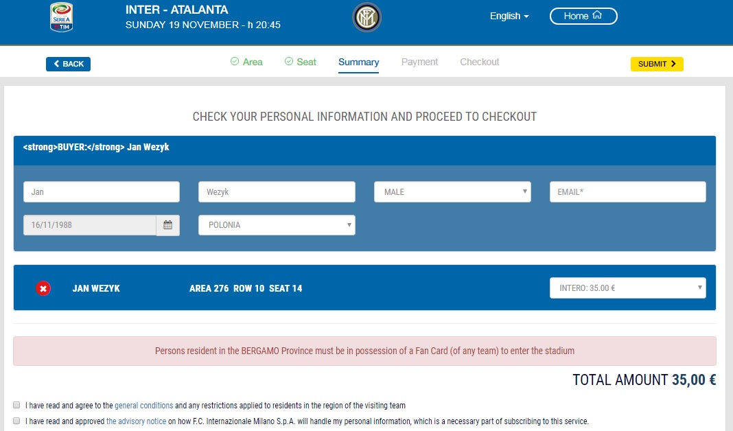 Bilety na mecz do kupienia na oficjalnej stronie Interu Mediolan => http://www.inter.it/en/biglietteria gdzie za najtańsze bilety na to spotkanie do kupienia od 35€ (ok. 151zł). Do kupna biletu niezbędna jest bezpłatna rejestracja na stronie Interu Mediolan.