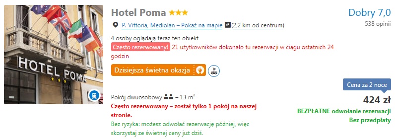 Proponujemy nocleg w 3-gwiazdkowym dobrze ocenianym hotelu Poma w centrum Mediolanu, gdzie za 2 noce dla 2 osób zapłacimy 424zł (106zł/os/noc).