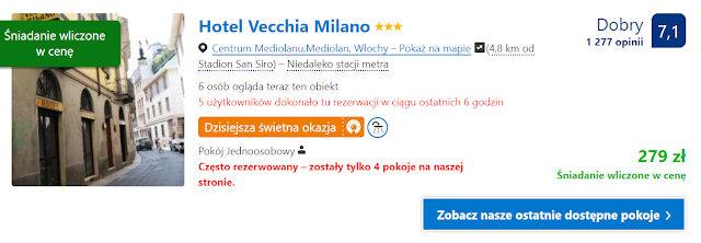 Pobyt proponujemy w Hotel Vecchia Milano gdzie za pokój jednoosobowy wraz ze śniadaniem zapłacimy 279 zł.