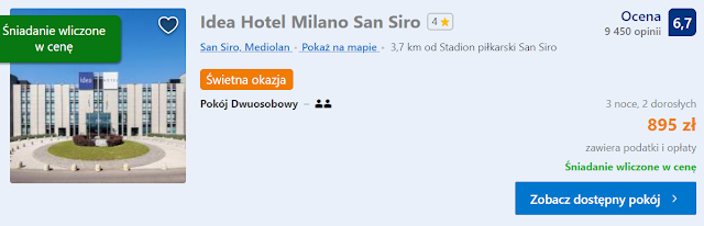 Proponujemy obiekty zlokalizowane nieopodal Stadio Giuseppe Meazzy. Pierwszy z nich to Idea Hotel Milano San Siro, który oferuje nocleg w terminie 7-10 lutego ze śniadaniem w cenie 872 zł za jedną oraz 895 zł za dwie osoby (ok. 149,5 zł os./noc).