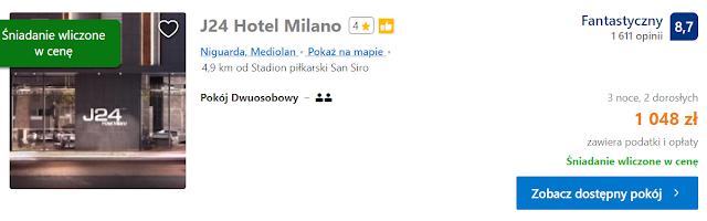 Droższym obiektem jest J24 Hotel Milano, gdzie za trzydniowy nocleg ze śniadaniem zapłacimy 1248 zł za pokój jednoosobowy oraz 1048 zł za pokój dwuosobowy (ok. 175 zł os./noc).