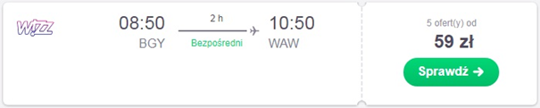 Powrót proponujemy dzień po spotkaniu 22.01, wszystkie propozycje obejmują loty z Mediolan-Bergamo. Za przelot do Warszawy zapłacimy 39 zł* (cena regularna 59 zł) REZERWUJ====>, do Krakowa 70 zł REZERWUJ ====> i do Wrocławia 70 zł. REZERWUJ ====>