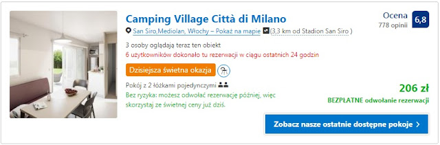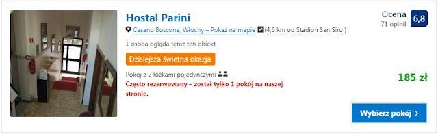 Proponujemy dwie opcje noclegowe na jedną noc, dla dwóch osób nieopodal stadionu w Mediolanie: Hostal Parini za 185 zł (93 zł/os/noc) oraz Camping Village Citta di Milano za 206 zł (103 zł/os/noc).