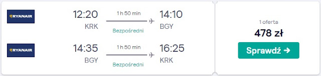 Proponujemy bezpośrednie loty w obie strony do portu Mediolan Bergamo w dniach 20-22.12. Istnieje wówczas możliwość podróży z Warszawy za 338 zł (cena regularna 410 zł) REZERWUJ====> oraz Krakowa za 478 zł REZERWUJ====>