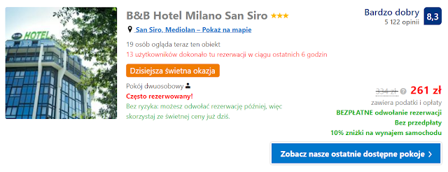 Proponujemy pobyt w B&B Hotel Milano San Siro, w którym doba hotelowa w dniach 10-11 marca kosztuje 240 zł za jedną oraz 282 zł za dwie osoby (141 zł os./noc). Opcją rezerwową może być Idea Hotel Milano San Siro, gdzie za nocleg w tym samym terminie zapłacimy 282 zł (141 zł os./noc) za pokój dwuosobowy.