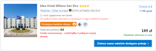 Proponujemy nocleg w w pobliżu San Siro. Pierwsza propozycja to Idea Hotel Milano San Siro gdzie za pokój dwuosobowy ze śniadaniem wliczonym w cenę zapłacimy 189 zł za noc (ok.95 zł za osobę za noc) . Druga Propozycja to Hotel Certosa, który leży jeszcze bliżej San Siro, tam za pokój dwuosobowy zapłacimy 189 zł (ok.95 zł za osobę za noc).