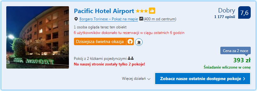 Proponujemy nocleg w Pacific Hotel Airport gdzie za noc w pokoju dwuosobowym zapłacimy 393 zł ( ok. 197 zł os./noc).