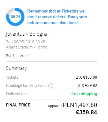 Otwarta sprzedaż biletów na oficjalnej stronie Juventusu rusza 23 kwietnia, a najniższy koszt wejściówki to 37,5€ ( ok. 162 zł). Należy pamiętać, że ilość biletów może być ograniczona ponieważ od 19 kwietnia rusza sprzedaż dla kibiców posiadających członkostwo. W celu zapewnienia sobie wejściówki można rozpatrzyć zakup karty członkowskiej, która ważna będzie rok od daty zakupu. Cena karty dla kibiców spoza Włoch to koszt 65 € (ok . 279 zł) Sprawdź ====>