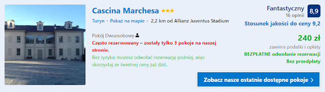 Alternatywą może być Cascina Marchesa. Koszt noclegu w dniach 20-21 kwietnia wynosi 222 zł* za pokój jednoosobowy oraz 388 zł* za pokój dwuosobowy (194 zł os./noc).