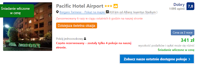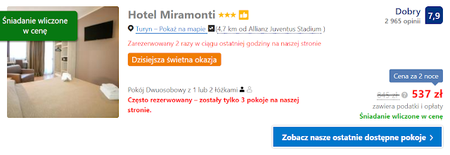 Dla kibiców, którzy do Turynu wybierają się z osobą towarzyszącą oferujemy Hotel Miramonti. Tutaj za pokój dwuosobowy ze śniadaniem zapłacimy 561 zł* (280,5 zł os./noc).