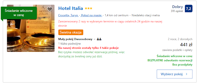 Na dwudniowy pobyt w Turynie w terminie 18-20 stycznia polecamy hotele zlokalizowane w miarę blisko centrum miasta. Pierwszy to Hotel Italia, którego dodatkową zaletą jest obecność stacji metra w okolicy oraz śniadania wliczone w cenę rezerwacji. Za pokój jednoosobowy w tym obiekcie zapłacimy 417 zł, a za “dwójkę” 441 zł.