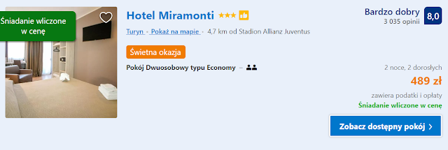 Droższym ale znajdującym się jeszcze bliżej Allianz Stadium obiektem jest Hotel Torino Royal. Za nocleg w terminie 14-16 grudnia ze śniadaniem zapłacimy 534 zł za za pokój jednoosobowy oraz 616 zł za pokój dwuosobowy (154 zł os./noc).