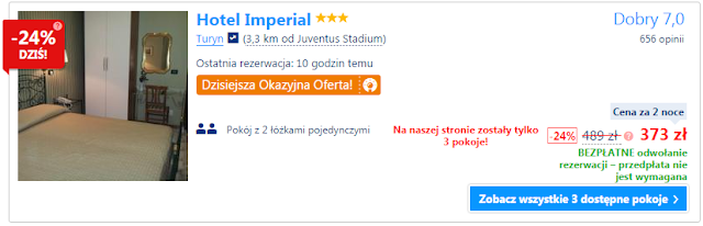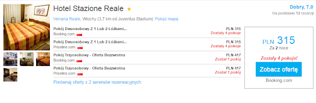 Na dwa dni w Turynie proponujemy nocleg w pobliżu stadionu Juventusu (w odległości 3,7 km i 3,3 km). Za pokój dwuosobowy za 2 dni w pierwszej opcji zapłacimy od 315 zł (niecałe 80 zł za osobę za noc) zarezerwuj TUTAJ====>. W drugiej opcji za 2 dni zapłacimy 373 zł ( nieco ponad 90 zł za osobę za noc) zarezerwuj TUTAJ====>