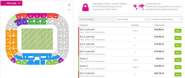 Bilety na mecz dostępne są od ok 410 zł zarezerwuj TUTAJ====>. Należy dodać, że bilety dostarczane są na ternie Włoch, warto zatem wskazać swój adres hotelowy jako miejsce dostarczenia wejściówek.