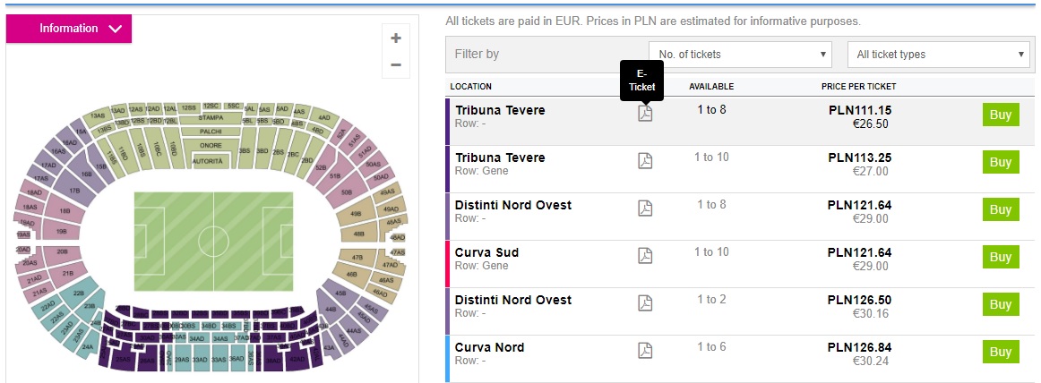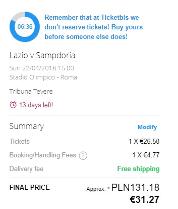 Z dużym prawdopodobieństwem w najbliższym czasie będziemy w mogli zakupić bilety na oficjalnej stronie Lazio. Na tą chwilę brak jednak informacji o cenach i terminach dystrybucji. Zazwyczaj bilety pojawiają się ok. tygodnia przed meczem. Obecnie wejściówki dostępne są za pośrednictwem rynku wtórnego. Za najtańsze wejściówki zapłacimy już od ok. 132 zł (cena zależna od kursu walut w danym banku). Bilet otrzymamy drogą elektroniczną. REZERWUJ ==== >