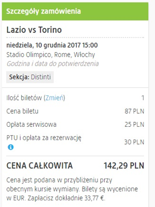 Wejściówki na spotkanie do nabycia są na rynku wtórnym, najtańsze dostępne są już od 143 zł. Bilet otrzymamy w formie elektronicznej do wydruku REZERWUJ====>. Wejściówki na mecz mogą być dostępne w późniejszym terminie w oficjalnej sprzedaży na stronie klubowej Lazio, w jeszcze niższych cenach.