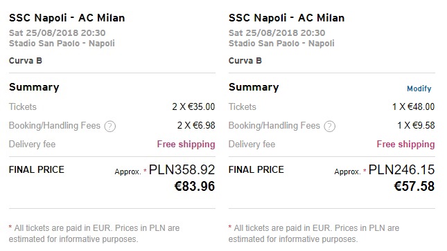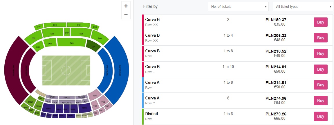 Obecnie najtańsze wejściówki na mecz zakupimy na rynku wtórnym, gdzie przy zakupie dwóch biletów zapłacimy ok. 180 zł za bilet, natomiast przy zakupie pojedynczej wejściówki zapłacimy ok. 247 zł REZERWUJ ==== > . UWAGA!!! Nie przechodzimy na polską wersję (Stubhub) a pozostajemy w angielskiej wersji strony (ticketbis.net) – znajdziemy tam zdecydowanie tańsze bilety! Bilety dostarczane są wyłącznie na terenie Włoch. Należy uprzedzić hotel lub znajomego, u którego planujemy nocleg o nadejściu przesyłki. Przy zakupie należy podać dokładne dane wszystkich osób, które będą chciały uczestniczyć w meczu.