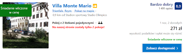 Dla kibiców preferujących nocleg bliżej Stadio Olimpico polecamy oddalony o kilometr od stadionu Villa Monte Mario. Za jednodniowy pobyt w pokoju jedno/dwuosobowym ze śniadaniem zapłacimy 233/271 zł (135,5 zł os./noc).