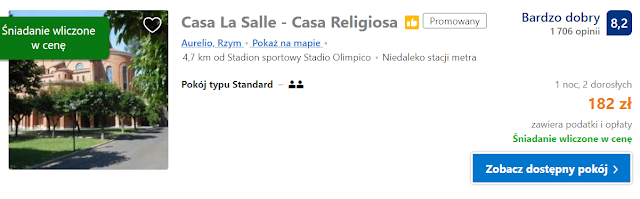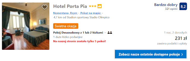 W podobnej odległości od Stadio Olimpico zlokalizowany jest Hotel Porta Pia. Za nocleg w terminie 7-8 grudnia zapłacimy 194 zł za jedną oraz 231 zł za dwie osoby (115,5 zł os./noc).
