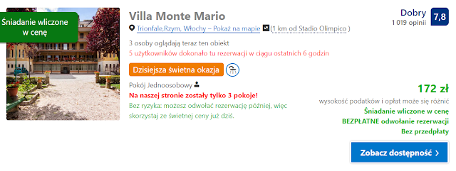 Polecamy nocleg w dniach 8-9 grudnia w Villa Monte Mario, który jest oddalony o kilometr od Stadio Olimpico. Koszt pobytu wraz ze śniadaniem wynosi 172 zł za pokój jednoosobowy oraz 216 zł (108 zł os./noc) za dwuosobowy.