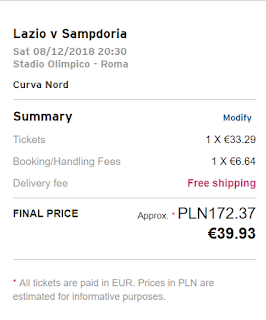 Bilety na ten mecz prawdopodobnie będzie można zakupić na oficjalnej stronie SS Lazio kilka dni przed wydarzeniem. Aktualnie wejściówki nabędziemy za pośrednictwem rynku wtórnego w cenie (wraz z opłatą manipulacyjną) 39,93 EUR (ok. 172 zł) REZERWUJ====>.