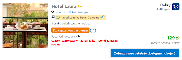 Natomiast dla kibiców, którzy wolą obiekt zlokalizowany bliżej lotniska Rzym Ciampino polecamy Hotel Laura znajdujący się niecały kilometr od portu lotniczego. Koszt pobytu w pokoju jednoosobowym wynosi 129 zł.