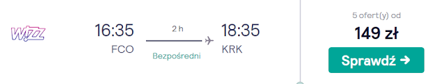 Zaś z Rzymu dotrzemy do Krakowa za 119 zł* (cena regularna 149 zł) REZERWUJ====> oraz Wrocławia za 163 zł REZERWUJ====>.