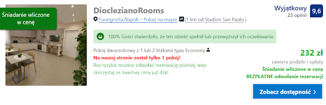 Innym rozwiązaniem jest zakwaterowanie się w DioclezianoRooms. Za pobyt w dniach 20-21 stycznia zapłacimy 232 zł za pokój jednoosobowy oraz 267 zł (133,5 zł os./noc). W podanych cenach wliczono koszt śniadania.