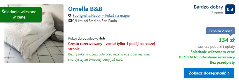 Proponujemy nocleg w obiekcie Ornella B&B gdzie za dwie noce w pokoju dwuosobowym zapłacimy 334 zł ( ok. 84 zł/os./noc). W tym samym obiekcie za jeden nocleg w pokoju dwuosobowym zapłacimy 189 zł (ok. 95 zł/os.). Obie oferty uwzględniają śniadanie w cenie.