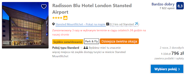 Proponujemy obiekty oddalone nieznacznie od lotnisk. Dla odlatujących z portu lotniczego Stansted polecamy Radisson Blu Hotel London Stansted Airport. Kosz noclegu w dniach 20-22 września wynosi 893 zł dla jednej oraz 796 zł (199 zł os./noc) dla dwóch osób.
