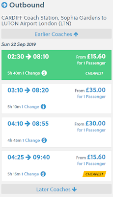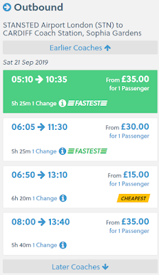 Transport pomiędzy londyńskimi lotniskami a Cardiff zapewni nam firma przewozowa National Express. Za przejazd 21 września wraz z powrotem w obie strony z lotniska Stansted zapłacimy od 28,60 GBP (ok. 141 zł) REZERWUJ====>, natomiast z Luton od 31,20 GBP (ok. 154 zł) REZERWUJ====>