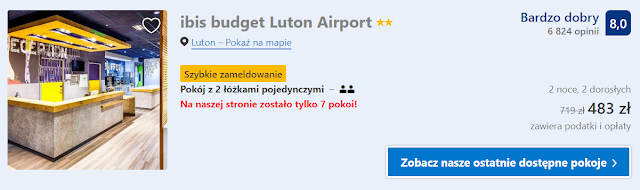 Kibice, którzy będą opuszczać Londyn z lotniska w Luton oferujemy dwudniowy pobyt w ibis budget Luton Airport. Za nocleg w pokoju jednoosobowym zapłacimy 530 zł, zaś w dwuosobowym 483 zł (ok. 121 zł os./noc).