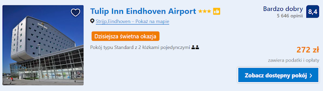 Dla kibiców, którzy zdecydują się odlecieć do Polski z Eindhoven proponujemy znajdujący się na terenie lotniska obiekt Tulip Inn Eindhoven Airport. Koszt jednodniowego nocleg w pokoju dwuosobowym z prywatną łazienką wynosi 334 zł* (167 zł os./noc).
