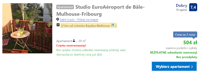 Proponujemy nocleg w dniach 7-9 grudnia. Ze względów logistycznych oferujemy pobyt w miejscach, które są oddalone w promieniu dwóch – trzech kilometrów od portu lotniczego w Bazylei. Pierwszy obiekt to Appartement EuroAirport Bâle-Mulhouse-Freiburg. Za apartament zapłacimy 430 zł (jedna osoba) oraz 473 zł (118,5 zł os./noc) za dwie osoby.