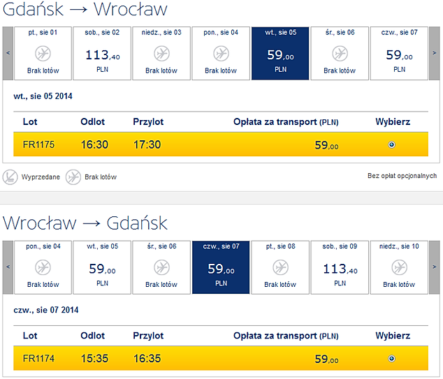 Z Gdańska liniami Ryanair do Wrocławia można dolecieć za 118zł w dwie strony. Wylot: 5.08 – Powrót: 7.08