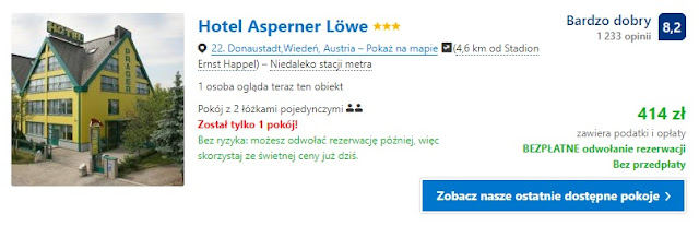 Dla Fanów chcących pozostać na noc w Wiedniu proponujemy Hotel Asperner Löwe, za który zapłacimy 292 zł (za pokój jednoosobowy) i 412 zł (za pokój dwuosobowy/206 zł os./noc).