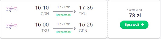 Proponujemy bezpośrednie loty na linii Gdańsk-Turku w dniach 26-28.10. Za przelot w obie strony zapłacimy 78 zł* REZERWUJ====>