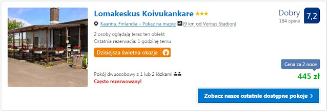 Noclegi w Finlandii nie należą do najtańszych, dlatego też przy pobycie na dwie noce jedną z propozycji może być skorzystanie z wynajmu poprzez AirBnb. W okolicach stadionu można wynająć pokój za 108 zł/dzień (54 zł/os/dzień) REZERWUJ====>